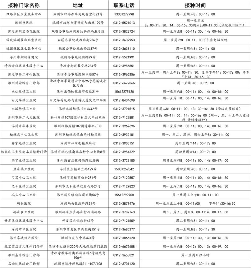 2. "涿州市某社区卫生服务中心预防接种门诊" - 地址:涿州市某区某街道某号(具体地址请查询当地官方信息) - 电话:010-xxxx-xxxx(具体电话请查询当地官方信息)