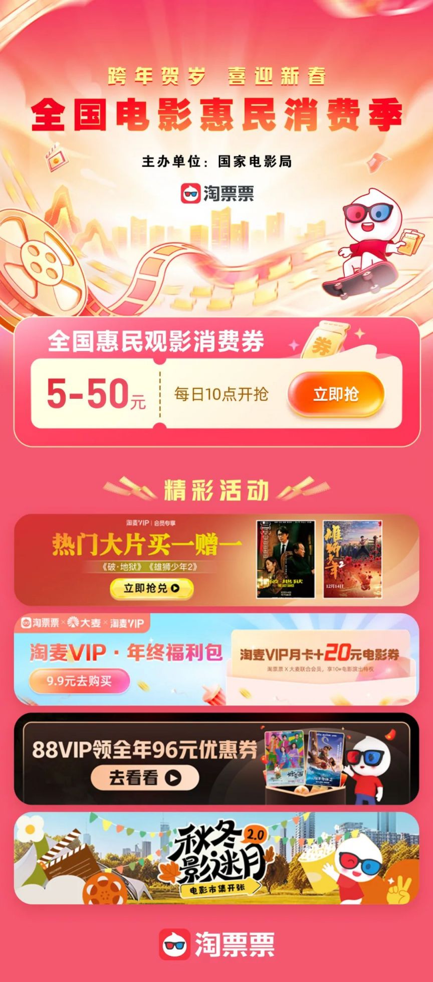 2024年12月9日至2025年2月28日,用户可通过淘票票App、微信淘票票小程序、支付宝淘票票小程序、淘宝淘票票小程序首页“全国电影惠民消费季”或“政府补贴”进入活动专题页领取5—50元红包,并且同时可享受淘票票买一赠一、淘麦VIP积分礼包、88VIP全年观影优惠券、影迷月活动。