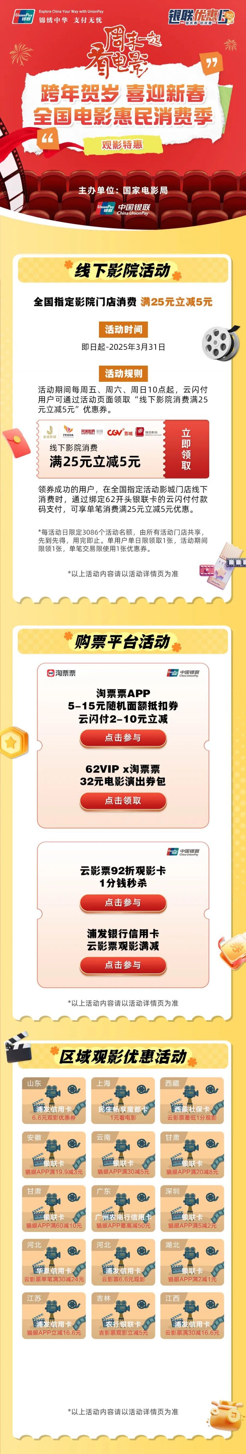 本次“跨年贺岁喜迎新春——全国电影惠民消费季”,从2024年12月延续至2025年2月,覆盖贺岁、元旦、春节等重要电影档期,惠及全国电影观众,中国工商银行、中国银联、猫眼娱乐、淘票票作为支持机构,将合计投入不少于6亿元观影消费补贴,4家支持机构将通过购票立减、抽奖观影、春节超值套票、异业联动等丰富有趣的形式,为广大电影观众带来实实在在的优惠