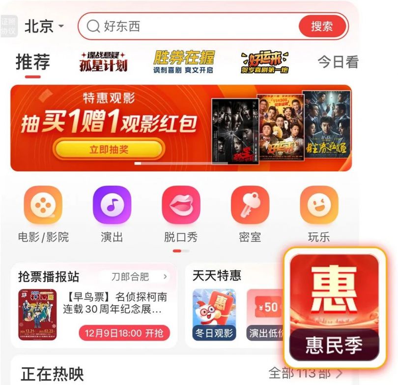 2024年12月9日至2025年2月28日,用户可以通过猫眼App、猫眼微信小程序、美团App、大众点评App任一渠道,进入“跨年贺岁喜迎新春——全国电影惠民消费季”页面,领取消费季专属优惠,参与冬日观影嘉年华、抽“买一赠一”观影红包、单片19.9元起大额补贴、春节超值特惠等活动,获得观影优惠。