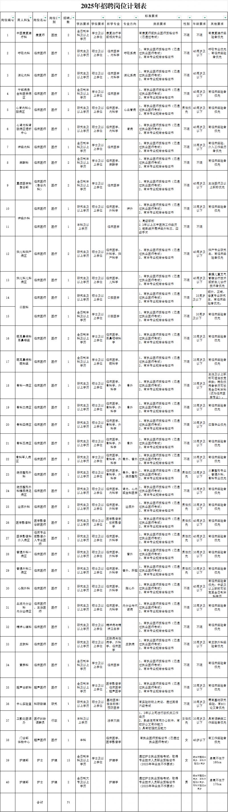 招聘岗位名额及所需具体条件详见《陆军第82集团军医院2025年招聘岗位计划表》(附件1)。岗位表中未明确任职经历和职称者,一般为初级职称岗位。