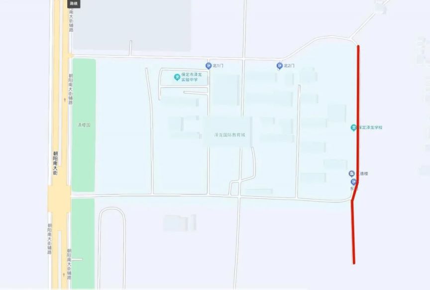 该校东门北至泽育西路路口,南至停车场丁字路口。