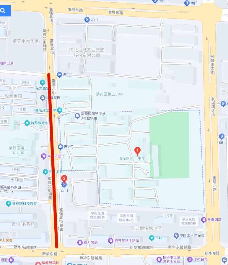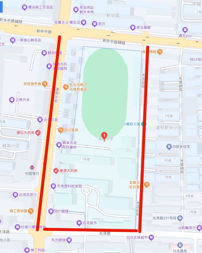 光泽路(外贸路口至清苑街段)、清苑街(光泽路至新华路段)、外贸路口北至新华路之间街道。